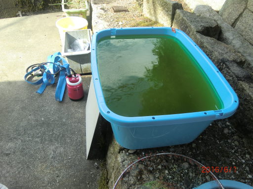 治療中の1匹が死にました(昨日、今日で合計3匹死にました)2016/6/3 守る会 再び緋鯉の治療をしました。パフラジンFを投入した薬液槽に4時間泳がせます。