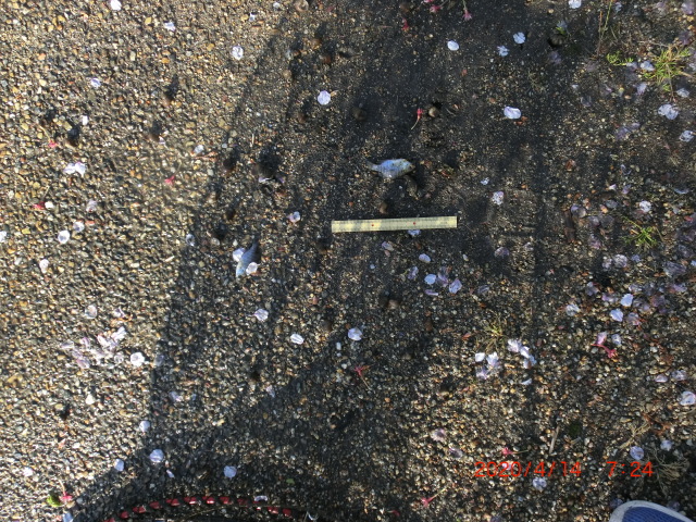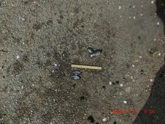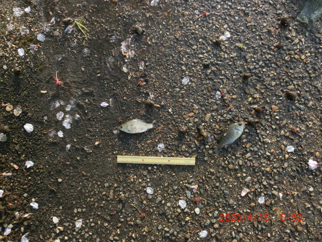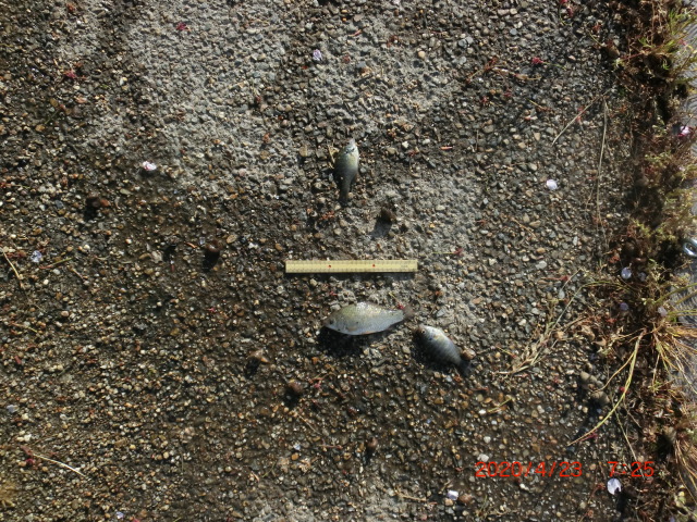2020/4/10 生態系調査 放流したにごろブナの生存確信 約8cm 数匹 ぼて1匹がいました ブルーギルはやはりいます1匹 町中小川泥の片づけ 写真