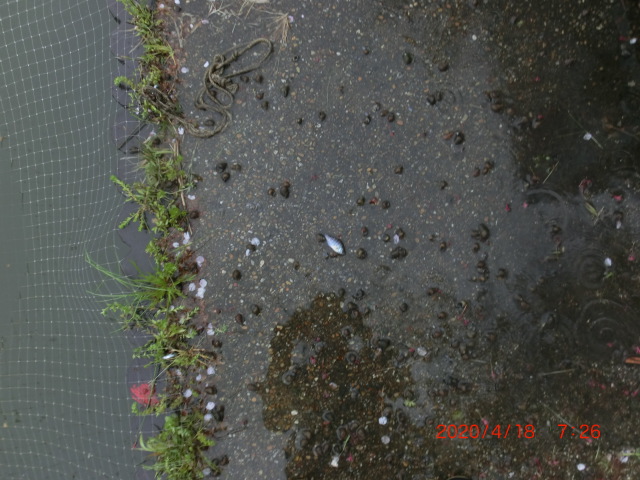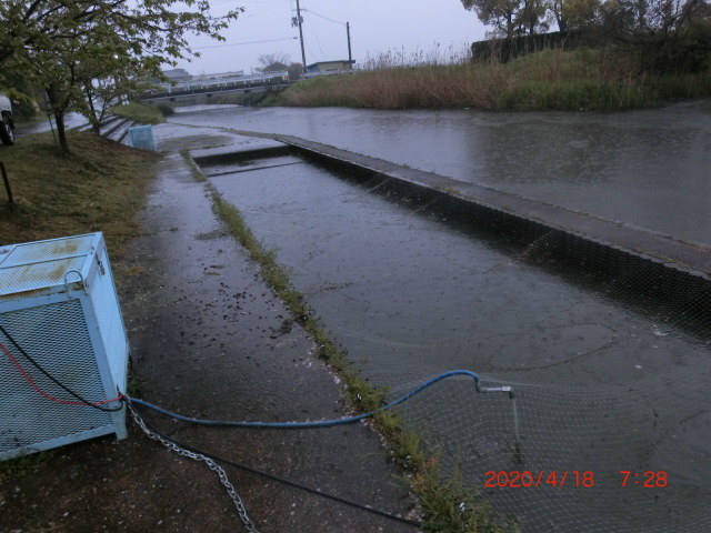 2020/4/18 生態系調査 ブルーギル 山寺川内は確認できず 写真 食用ガエル 大雨