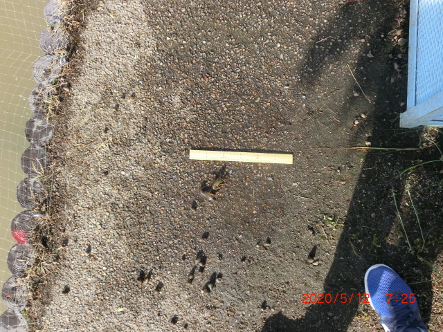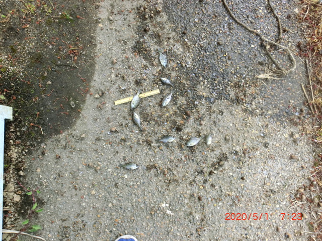 2020/5/1 生態系調査 かなりの数のブルーギル、町中小川 なし ブルーギル