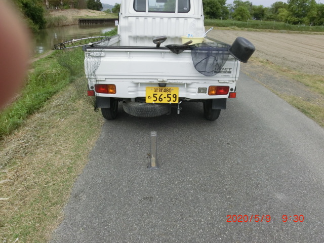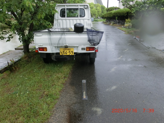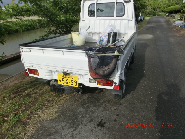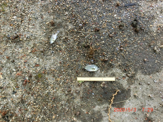 この時期町中小川放流中の魚が死にます 写真 濁水防止ののぼり 写真 写真2020/5/2 生態系調査 ブルーギル にごろフナ(少し小さい) ザリガニ 写真