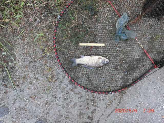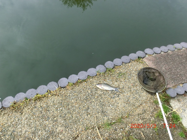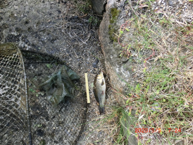 浅いところで2匹 ふな1匹、鯉1匹が釣れた。約20cm、放流ではないような感じ2020/4/13 生態系調査 ザリガニ 町中小川 なし 写真