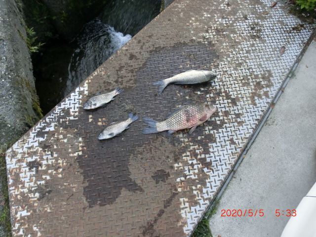 生態系調査 放流したのではなさそう フナ 1匹 町中小川 なし 写真2020/5/5 この時期町中小川放流中の魚が死にます。大きい2匹 上流 みんな鮒 写真