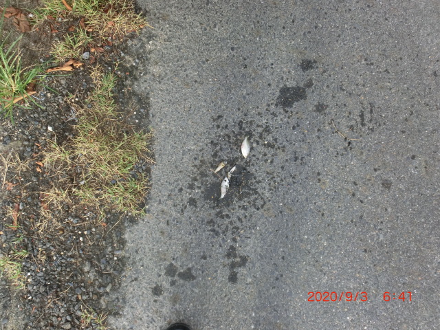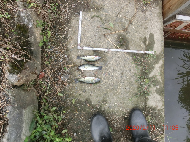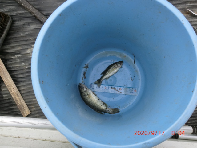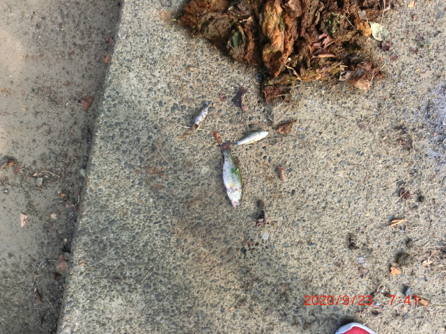 2020/9/23 山寺川施設 ふな2匹 死 なんでブラックバスが死んでいる?? いたずらかな 写真