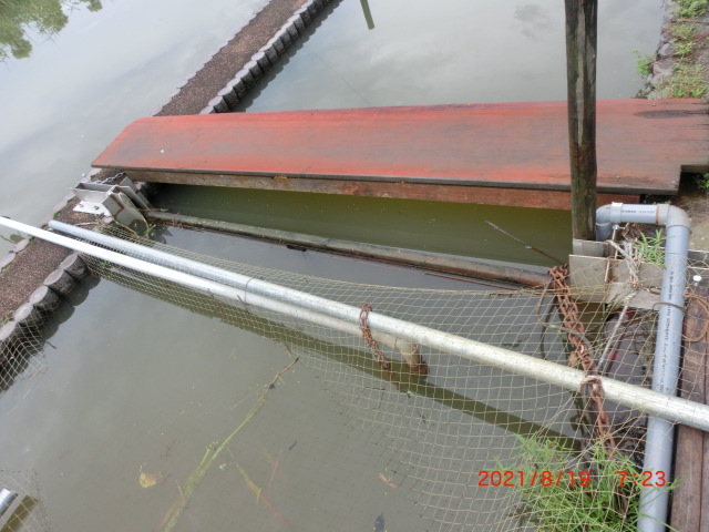 2021/8/23 異常気象見廻り 南郷洗堰開放水位は徐々に降下 洗堰全開で1cm/6hour 写真
