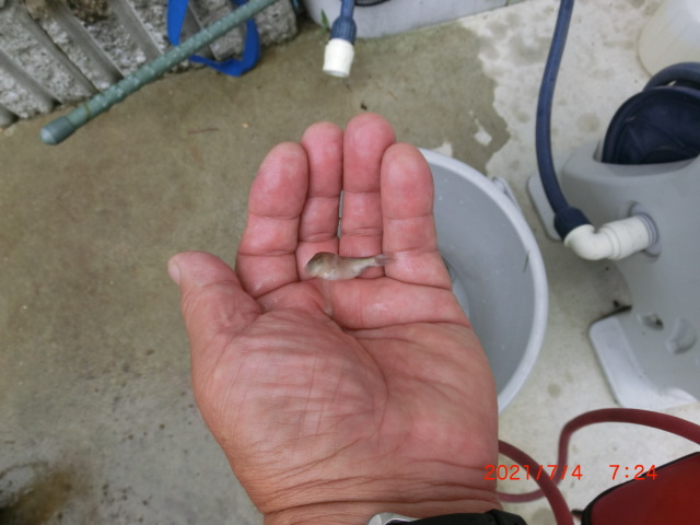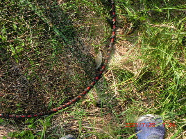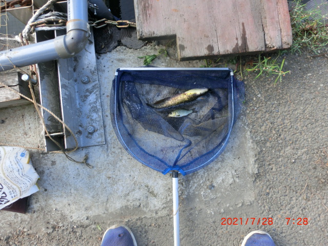 2021/7/24 生態系調査 洗い場 小鮒2匹捕獲 大きさは前日と同じ位