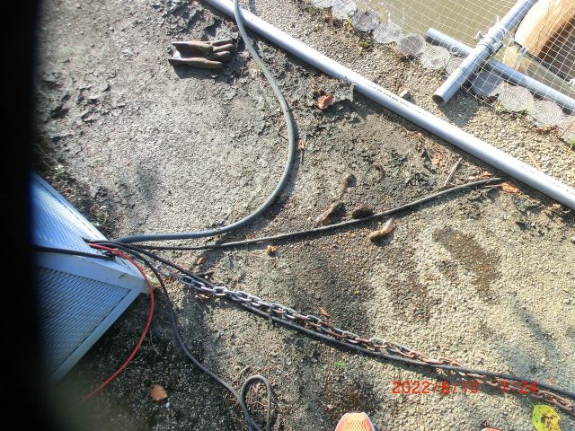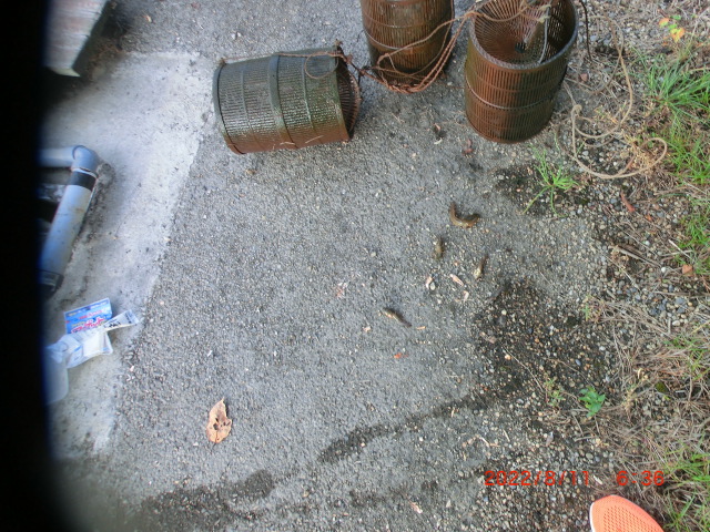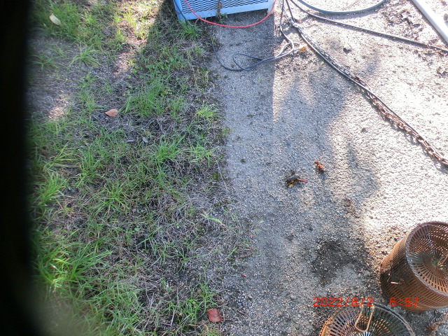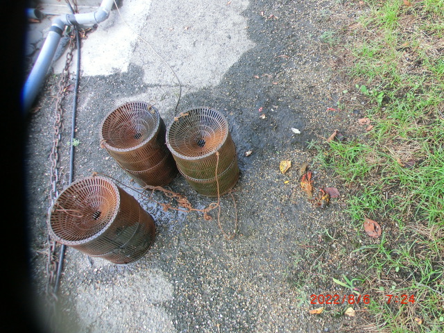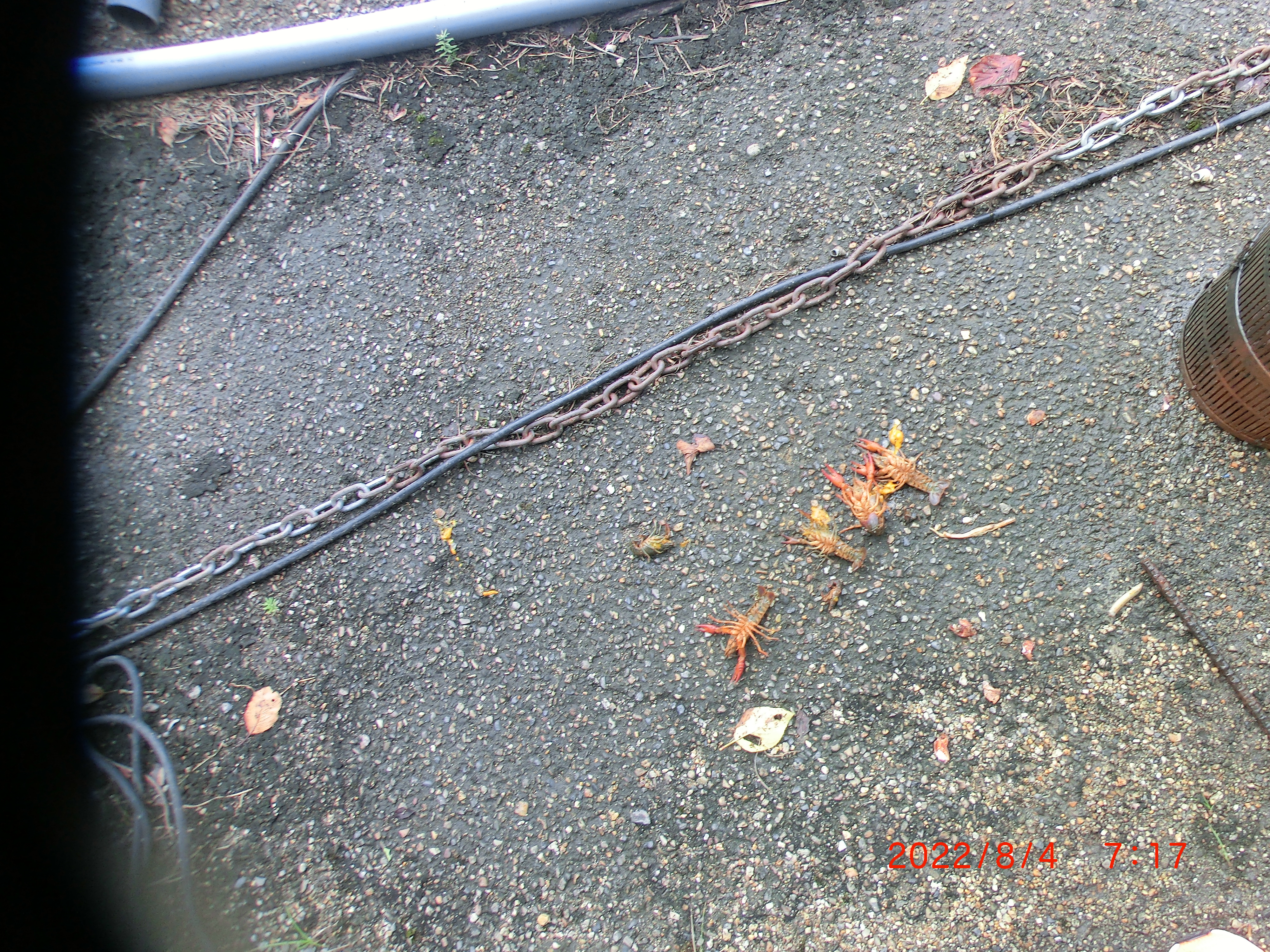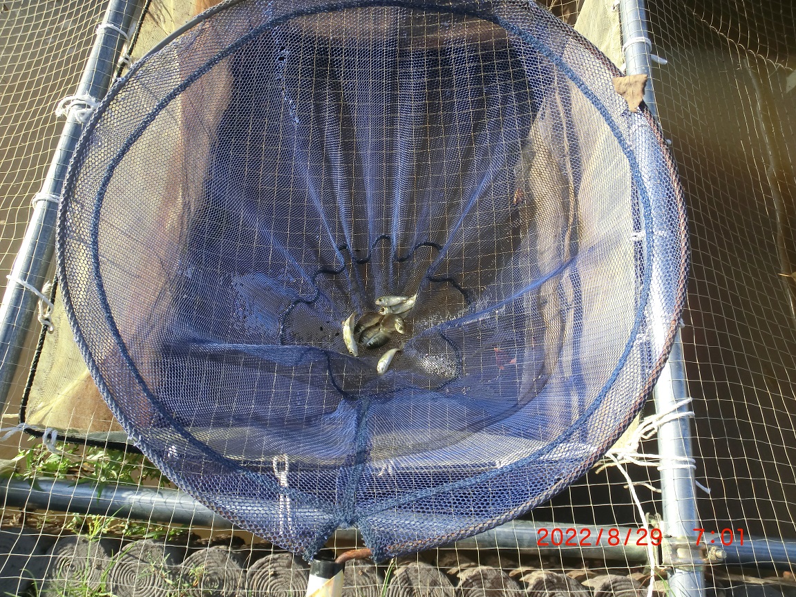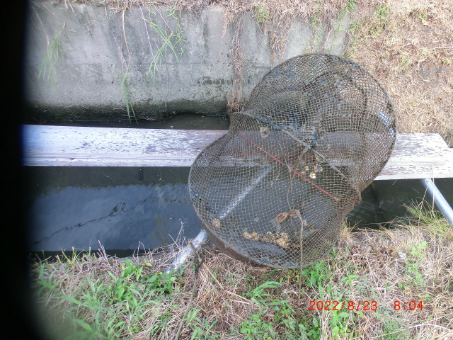 2022/8/4 生態系調査 ザリガニ 7匹捕獲 餌はスルメ+金魚の餌にしました。モンドリの位置を少し変更 写真