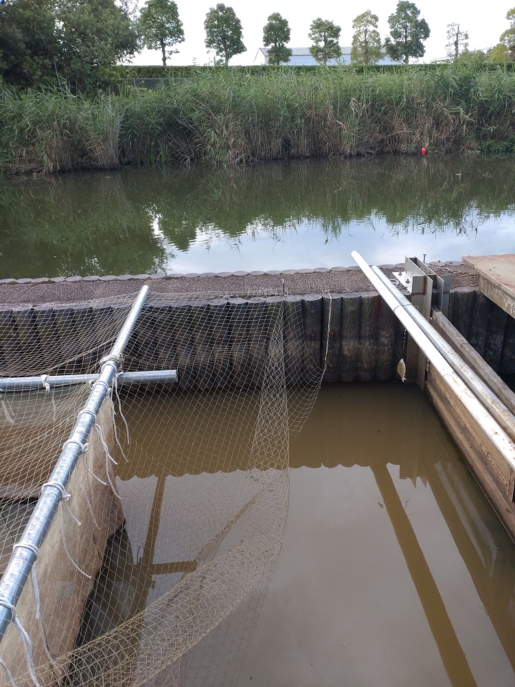 生態系調査 ザリガニ 1匹捕獲 餌はスルメ+緋鯉の餌にしました。モンドリの位置を少し変更 写真