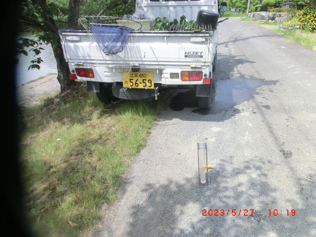 県から委託 外来植物の駆除 オオバナミズキンバイ ナガエノツルノゲイトウ ミズヒマワリ2023/5/18 透視度調査 A地点 20.0cm 写真 B地点 10.5cm 写真 C地点 12.5cm 写真